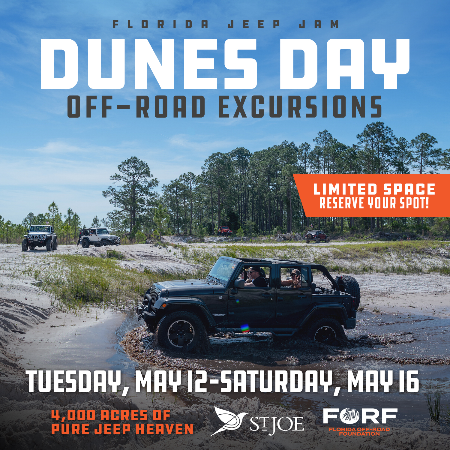 Tuesday through SaturdayFlorida Jeep Jam representatives scouted out what will be this year’s off road Dunes Day Excursion 4,000 acres of pure beauty and Jeep haven. These trail rides will be guided and space is very limited.