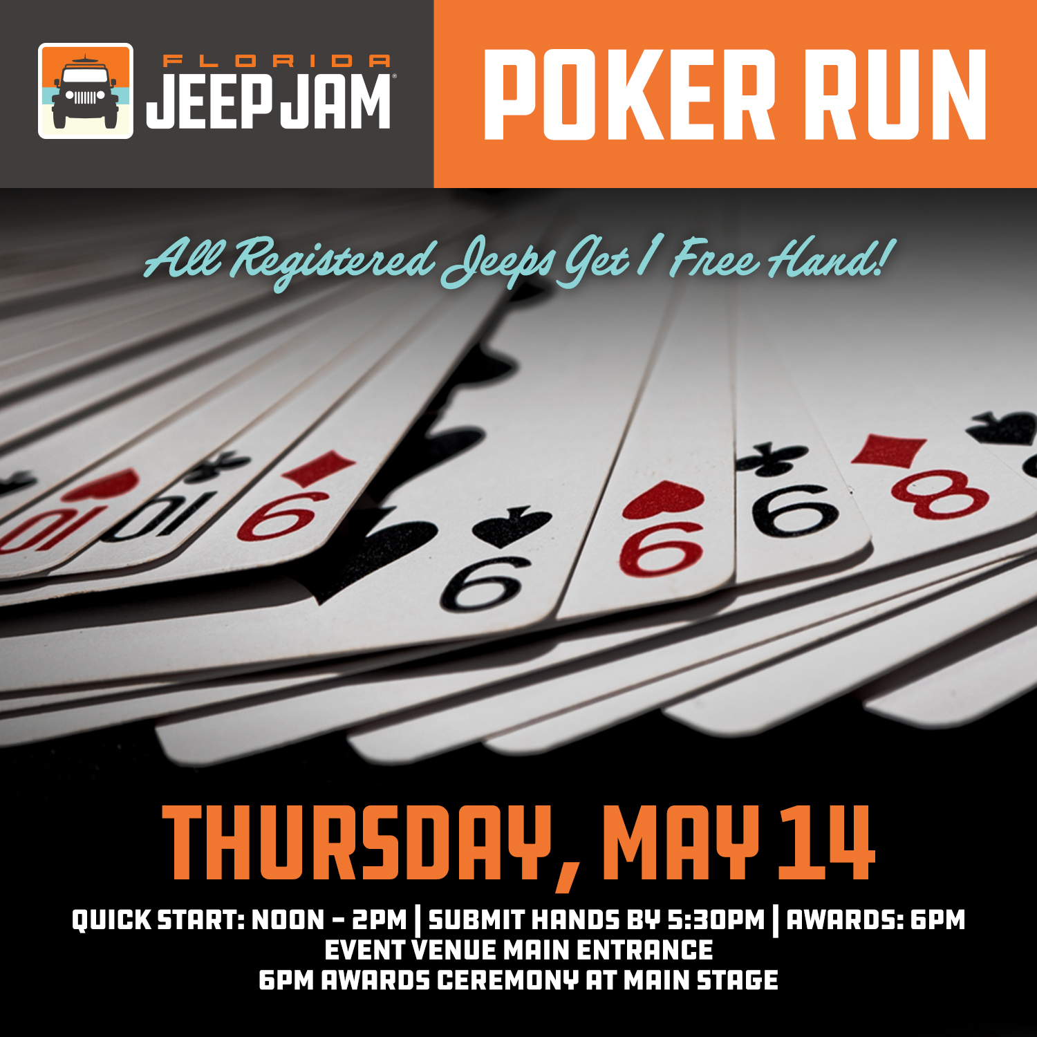Quick Start: Noon - 2pm | Submit Hands by 5:30pm | Awards: 6pmEvent Venue Main Entrance | All Registered Jeeps Get 1 Free Hand